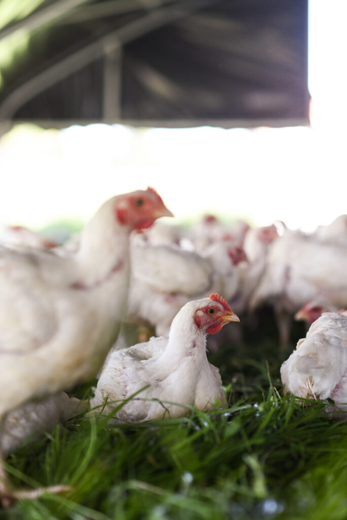 Our meat chickens are raised on pasture and moved to fresh grass every day in mobile shelters that protect them from sun and predators while still allowing them to live outdoors. As they rotate across our fields, the birds forage for bugs, seeds, clover, and grasses, with pasture making up about 40% of their diet. The rest is supplemented with an organic, custom-milled feed sourced locally to support steady, healthy growth.